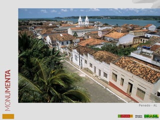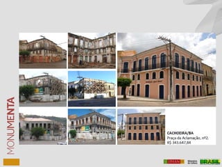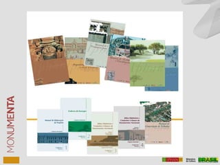 O documento descreve o Programa Monumenta, um programa do Ministério da Cultura brasileiro criado para preservar o patrimônio cultural sob proteção federal entre 2000-2009. O programa contou com financiamento do BID e de outros atores e investiu mais de US$ 132 milhões em 26 cidades brasileiras por meio de convênios, focando em obras de conservação, educação, promoção econômica e capacitação.