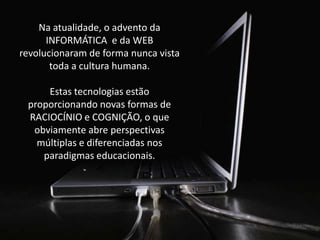 O documento discute como os MOOCs (Massive Open Online Courses) representam uma nova abordagem educacional que aproveita as tecnologias digitais para permitir a produção e compartilhamento de conhecimento de forma colaborativa e aberta entre especialistas e estudantes online. Os MOOCs conectam pessoas através de redes para construir conhecimento de forma cooperativa e sistêmica, ultrapassando os modelos educacionais tradicionais.