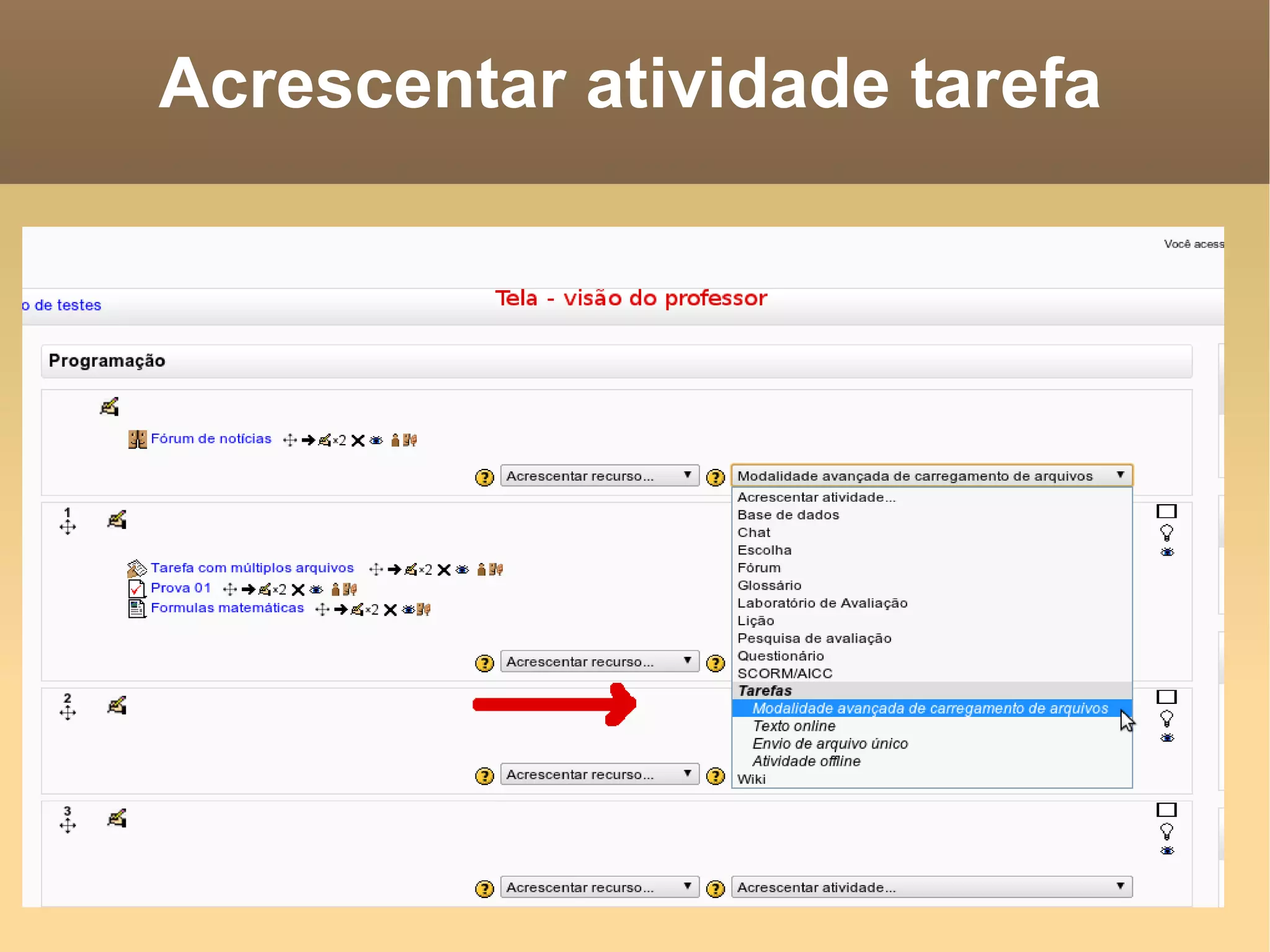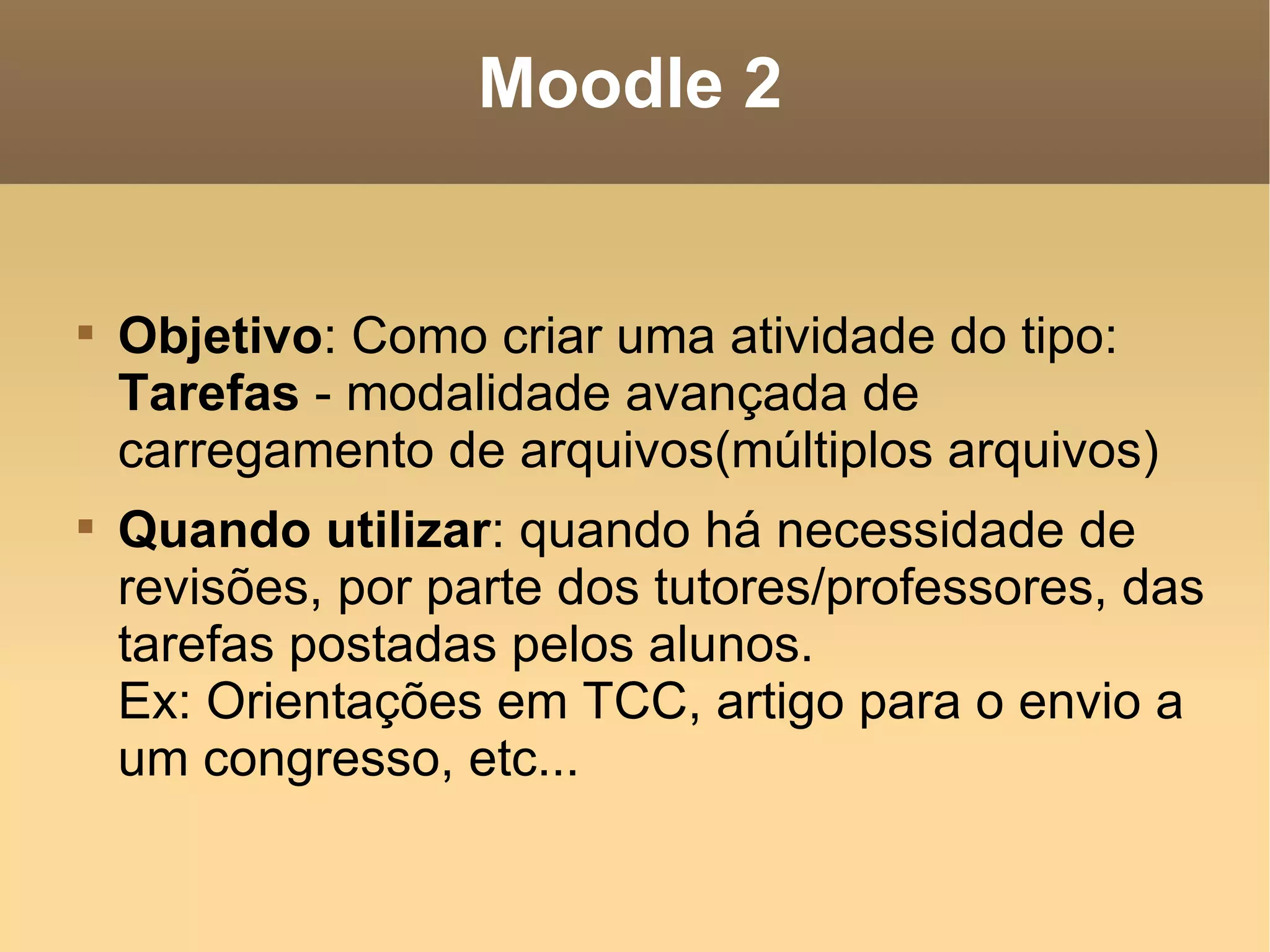 O documento fornece orientações sobre como criar uma atividade de tarefas no Moodle 2, permitindo o envio de múltiplos arquivos pelos alunos. Essa modalidade é indicada para situações que requerem revisões pelos tutores, como no envio de TCCs ou artigos para congressos. Contém instruções detalhadas sobre a visão do aluno e do professor em relação às tarefas.