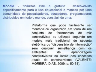 1. O documento apresenta uma introdução ao uso da plataforma Moodle, descrevendo suas principais funcionalidades para professores e tutores como atividades, recursos e grupos.