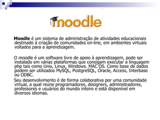 O Moodle é um sistema de administração de atividades educacionais para criar comunidades online voltadas para a aprendizagem. Ele é um software livre que pode ser instalado em diferentes plataformas e usa bancos de dados como MySQL. O TelEduc é um ambiente para criar, participar e administrar cursos na web, projetado para treinar professores em informática educacional com base em metodologia contextualizada. Ele foi desenvolvido de forma participativa para atender necessidades de usuários e é fácil de usar.