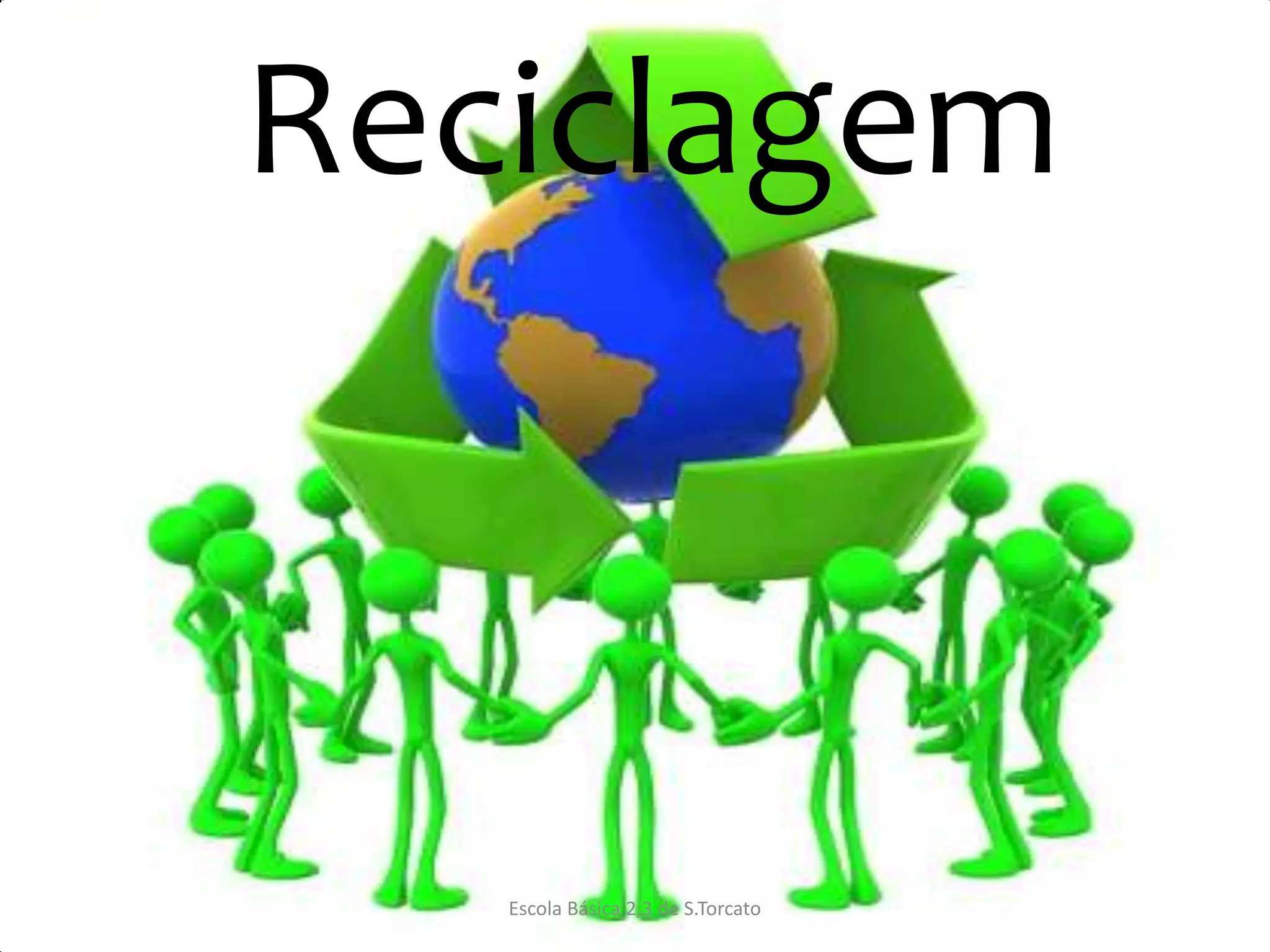 O documento discute a importância da reciclagem. Explica o que é reciclagem e os tipos de ecopontos usados para coletar diferentes materiais como papel, vidro e plástico. Também descreve as vantagens ambientais, econômicas e sociais da reciclagem e os três Rs: reduzir, reutilizar e reciclar. O documento pede que as pessoas adotem hábitos de reciclagem para ajudar o meio ambiente.
