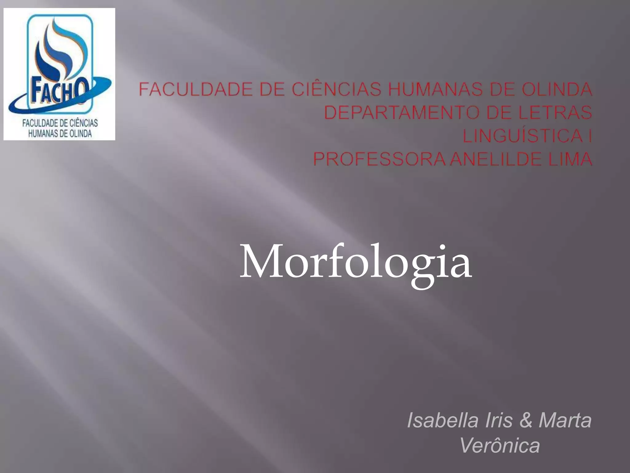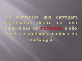 Este documento discute vários tópicos relacionados à morfologia. Apresenta definições de morfologia e palavra. Discutem-se critérios fonológicos e sintáticos para definir palavras. Exemplos demonstram afixos verbais em línguas como o kadiwéu. Também aborda processos morfológicos como derivação, flexão e influência da fonologia na morfologia. Por fim, discute-se teorias como a ótima e a não-concatenação na formação de palavras.
