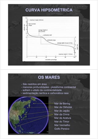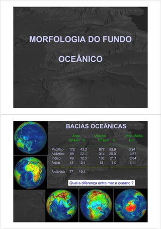 1) O documento descreve as principais características morfológicas dos fundos oceânicos, incluindo bacias oceânicas, planícies abissais, cordilheiras meso-oceânicas e fossas oceânicas. 2) São apresentadas as diferenças entre mares e oceanos, assim como as principais unidades morfológicas dos fundos oceânicos, como a plataforma continental, o talude e a elevação continental. 3) Inclui um histórico do mapeamento batimétrico