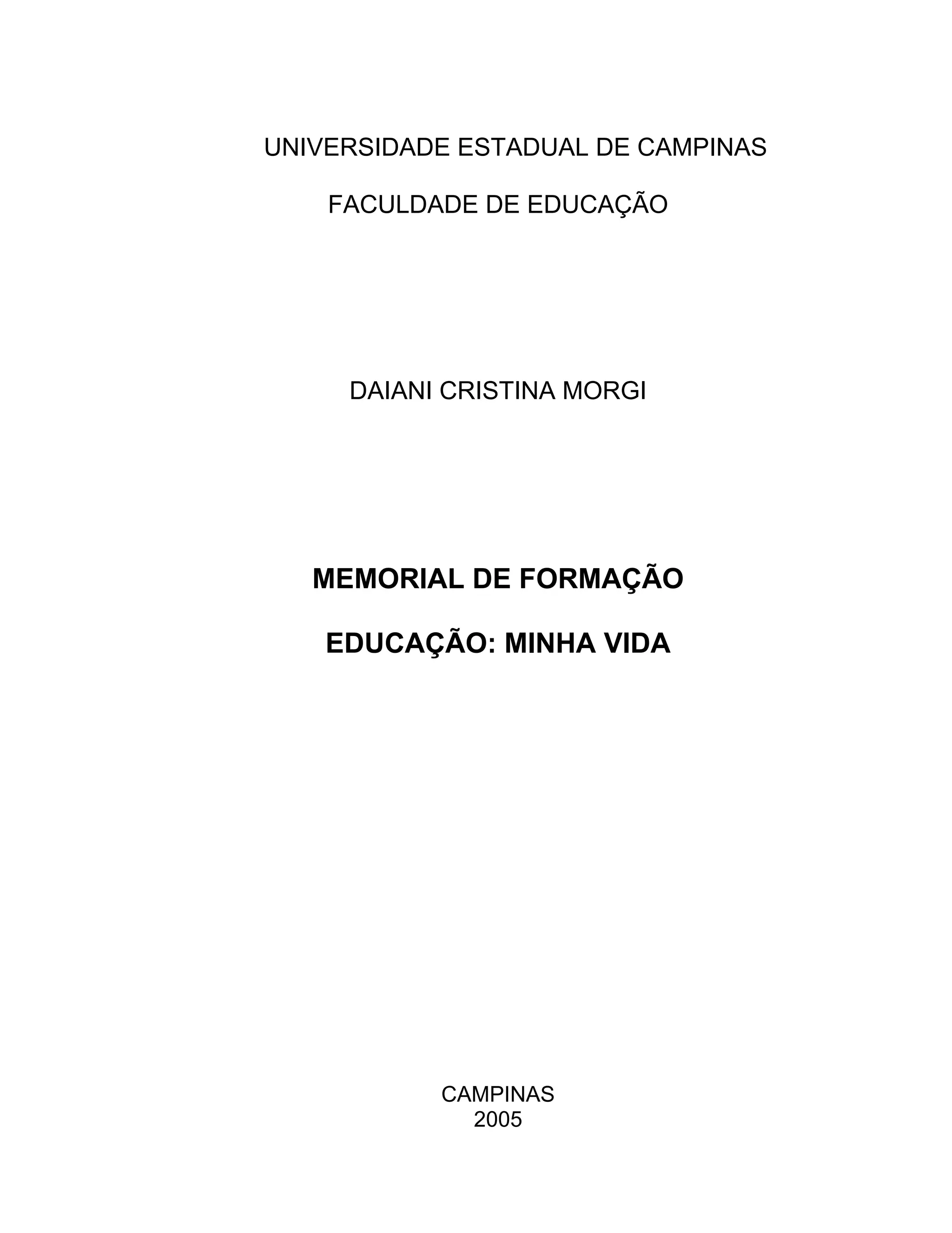 Este documento é um memorial apresentado por Daiani Cristina Morgi como parte dos requisitos para conclusão do curso de Pedagogia na Universidade Estadual de Campinas. Ele resume a história de vida e formação da autora, dividida em estações que representam diferentes períodos. A primeira estação descreve a infância e o interesse da autora pela educação, influenciada por seus professores. Ela sonhava em estudar na UNICAMP, mas teve uma educação básica marcada pelo ensino mecânico e falta de diálogo crítico.
