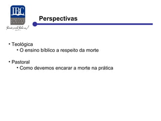 O documento discute as perspectivas teológica e pastoral da morte segundo a Bíblia. Apresenta os tipos de morte e a origem da morte como consequência do pecado. Explora o que acontece após a morte dos salvos e perdidos, rejeitando teorias como sono da alma ou reencarnação.