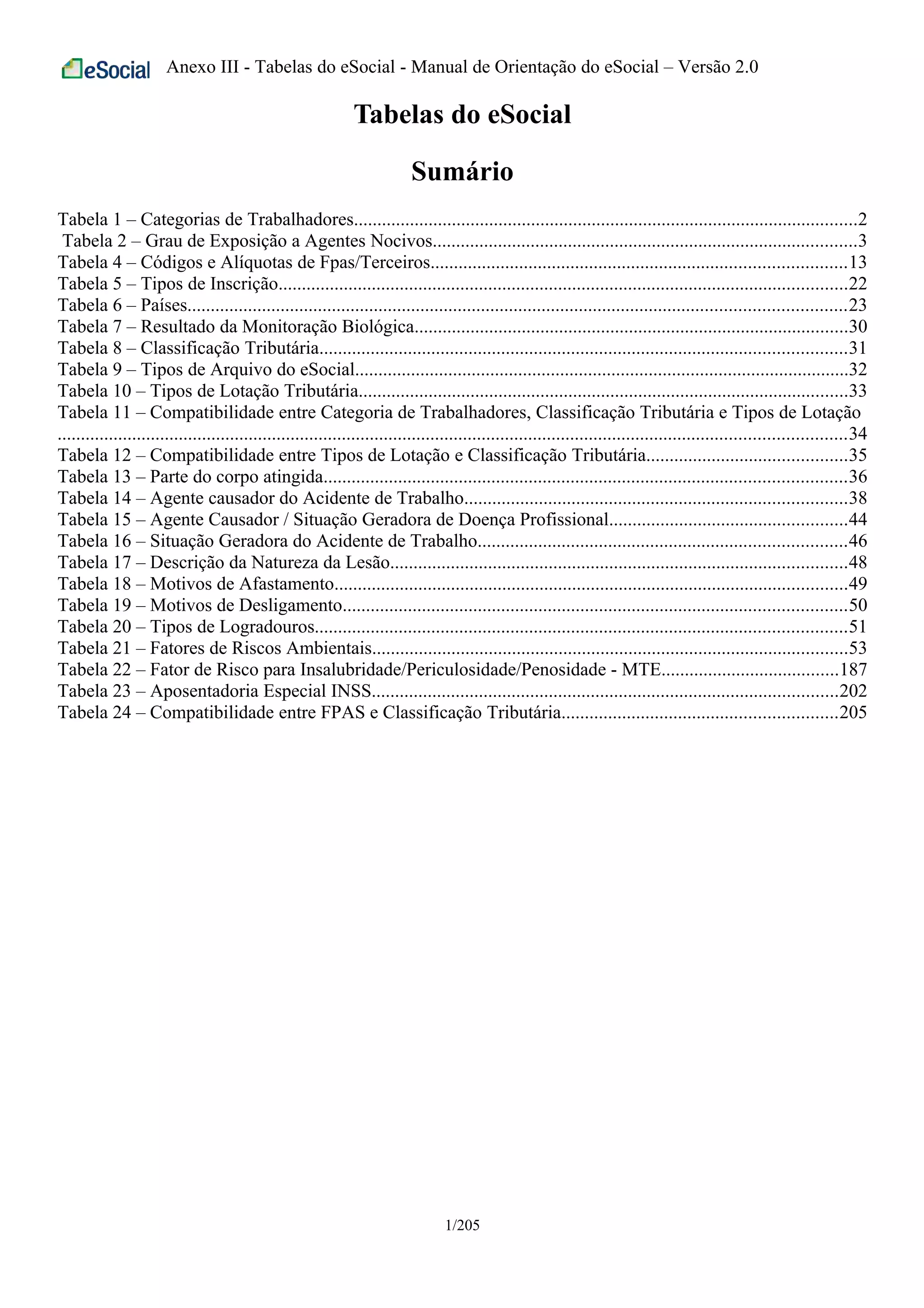 Este documento apresenta 24 tabelas de referência utilizadas pelo eSocial, sistema brasileiro de escrituração digital de obrigações fiscais, previdenciárias e trabalhistas. As tabelas definem códigos e descrições para categorias de trabalhadores, agentes causadores de acidentes e doenças ocupacionais, tipos de arquivos e mais.