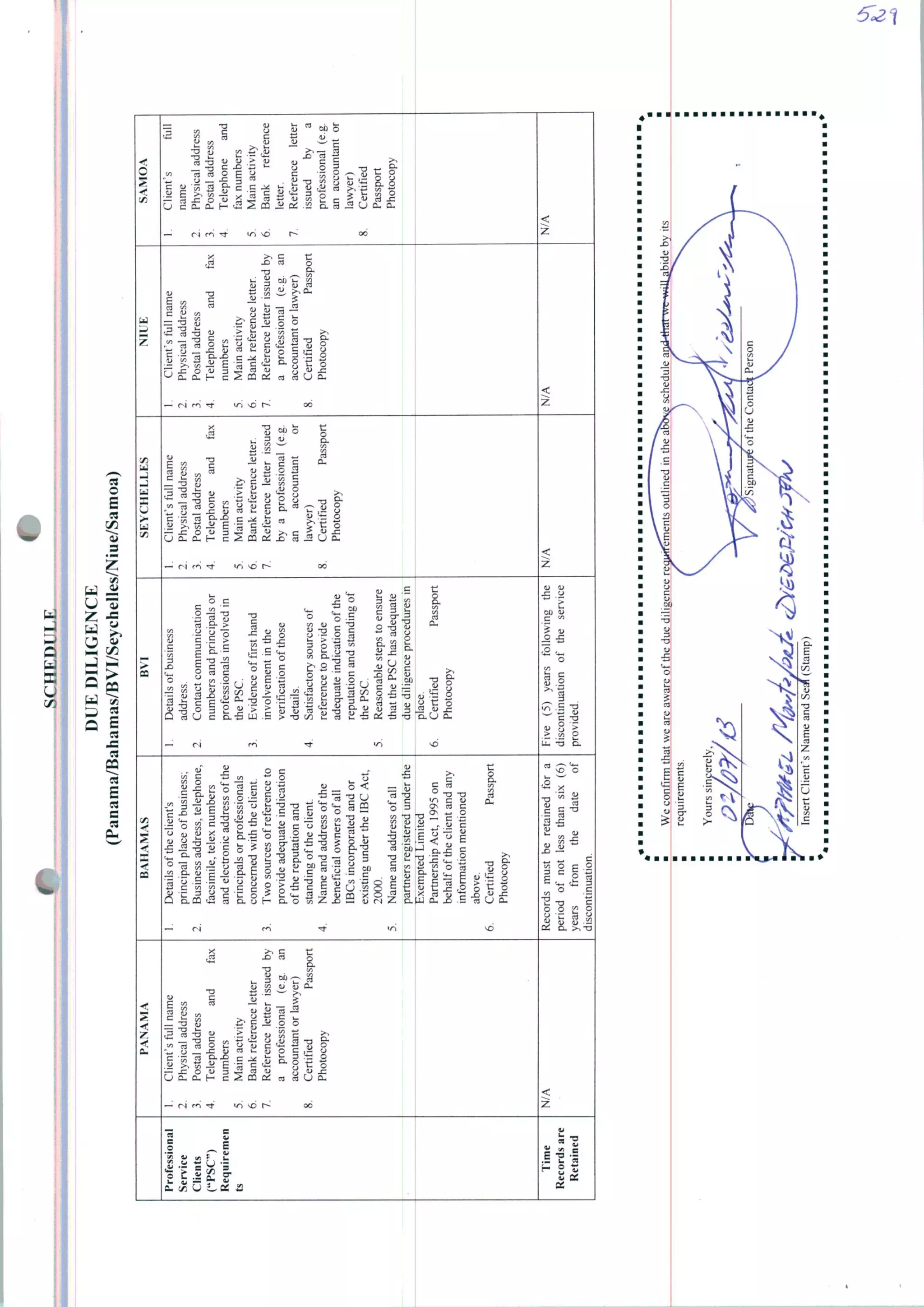 Este documento lista os requisitos de diligência devida para diferentes jurisdições, incluindo Panamá, Bahamas, Ilhas Virgens Britânicas, Seychelles, Niue e Samoa. Cada seção lista os documentos necessários, como nome completo do cliente, endereços, atividade principal e cartas de referência bancária e profissional. Também exige fotocópia autenticada do passaporte e especifica o período de retenção de registros.