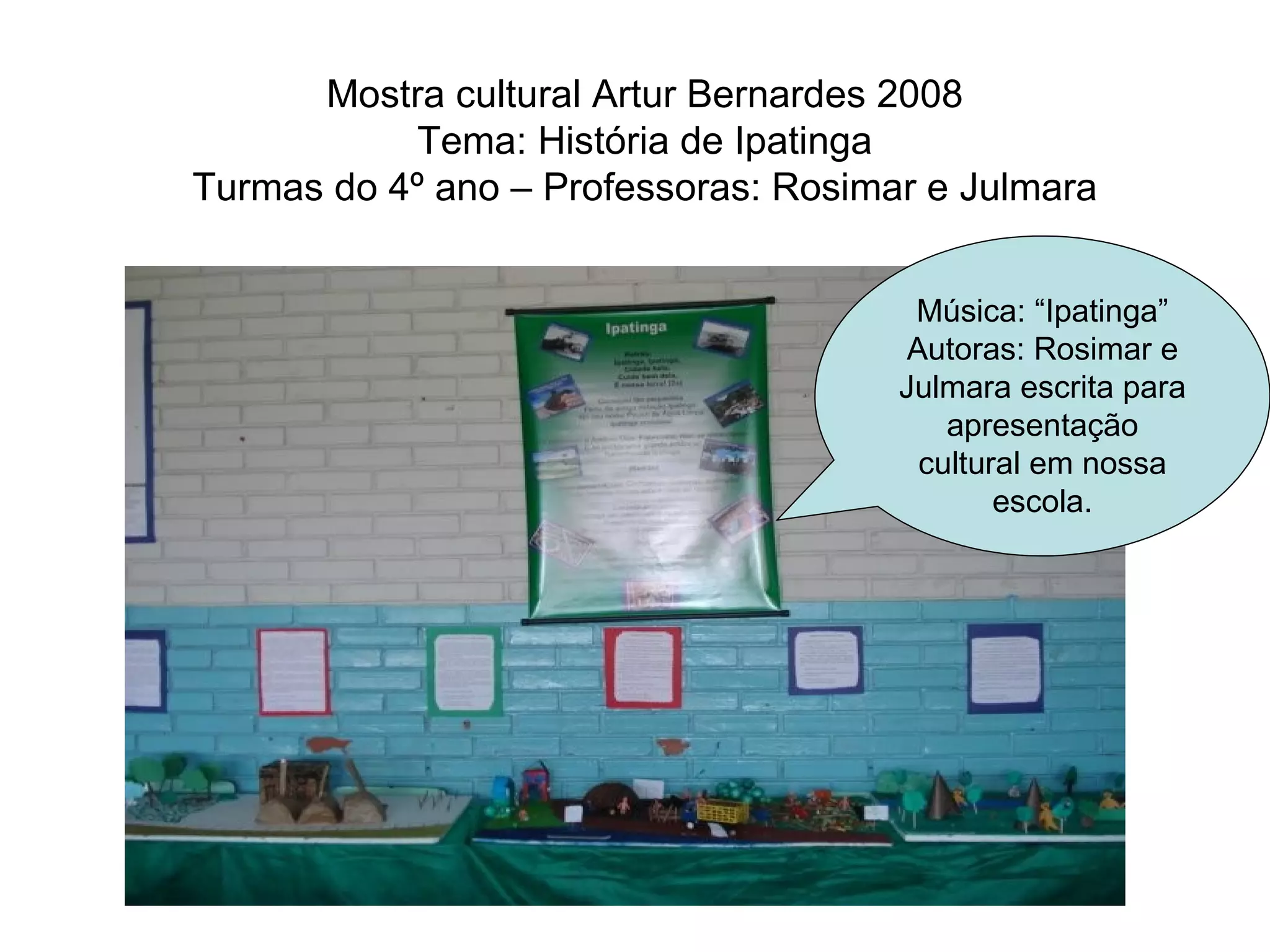 O documento descreve uma mostra cultural realizada por alunos do 4o ano da escola Artur Bernardes em 2008. Os alunos, sob a orientação das professoras Rosimar e Julmara, apresentaram maquetes e música representando a história de Ipatinga, desde a ocupação pelos índios Botocudos, passando pela época das carvoarias e chegada da estrada de ferro, até a cidade de Ipatinga atualmente.