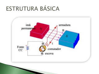 Um motor de corrente contínua converte energia elétrica em energia mecânica através de um estator, rotor e comutador. Baseia-se no princípio do eletromagnetismo onde uma corrente elétrica em um condutor cria uma força quando passa por um campo magnético. Motores CC são usados em diversas aplicações como brinquedos, veículos e sistemas de tração elétrica por permitirem controle preciso da velocidade.