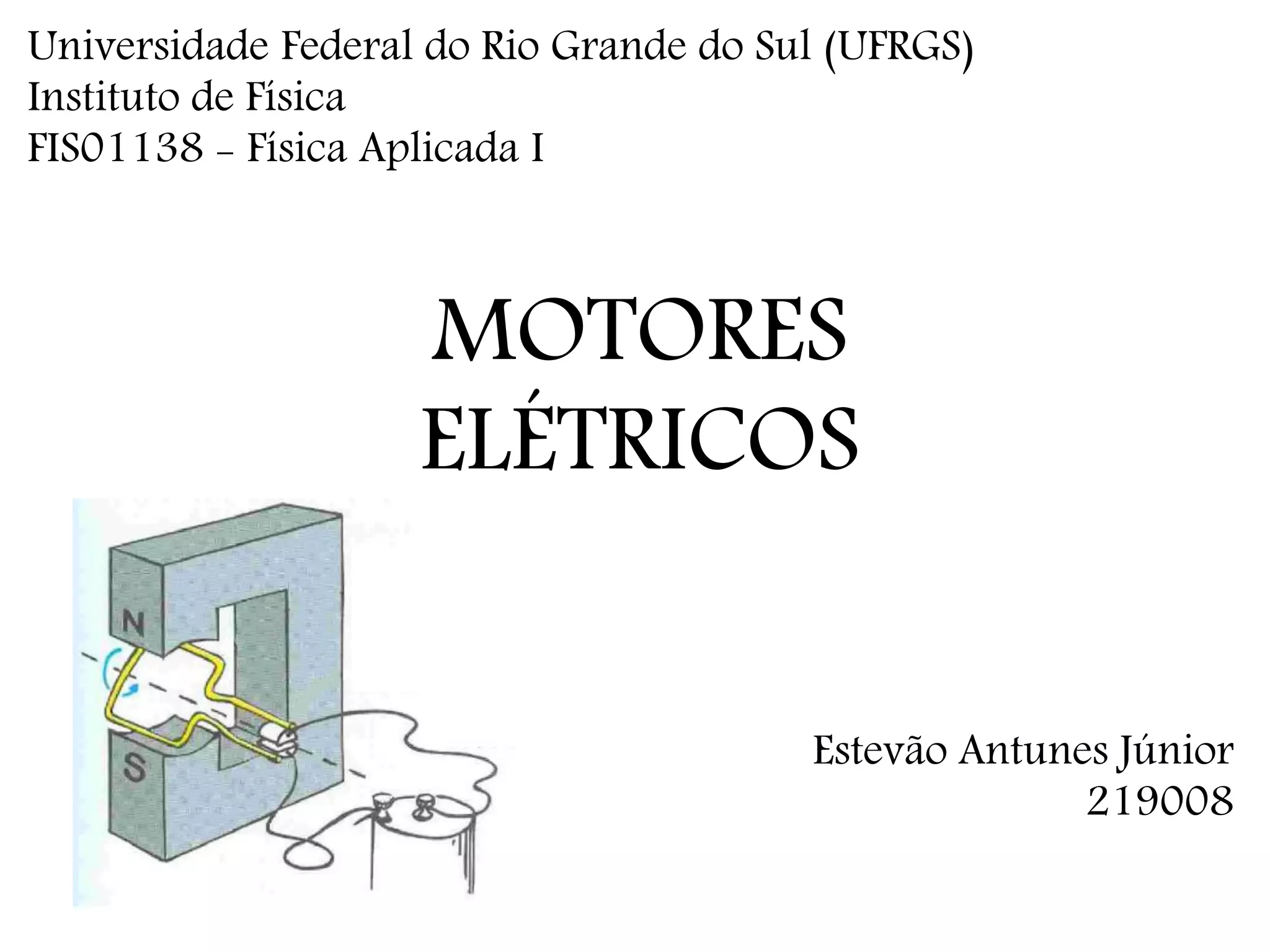 [1] O documento descreve os princípios físicos por trás dos motores elétricos, incluindo a indução eletromagnética, a força gerada por um campo magnético em corrente elétrica, e como isso pode ser usado para gerar torque em uma espira e fazer motores funcionarem; [2] É explicado como motores de corrente contínua e alternada funcionam, assim como motores elétricos lineares; [3] Referências bibliográficas sobre eletromagnetismo e motores elétricos são listadas no final