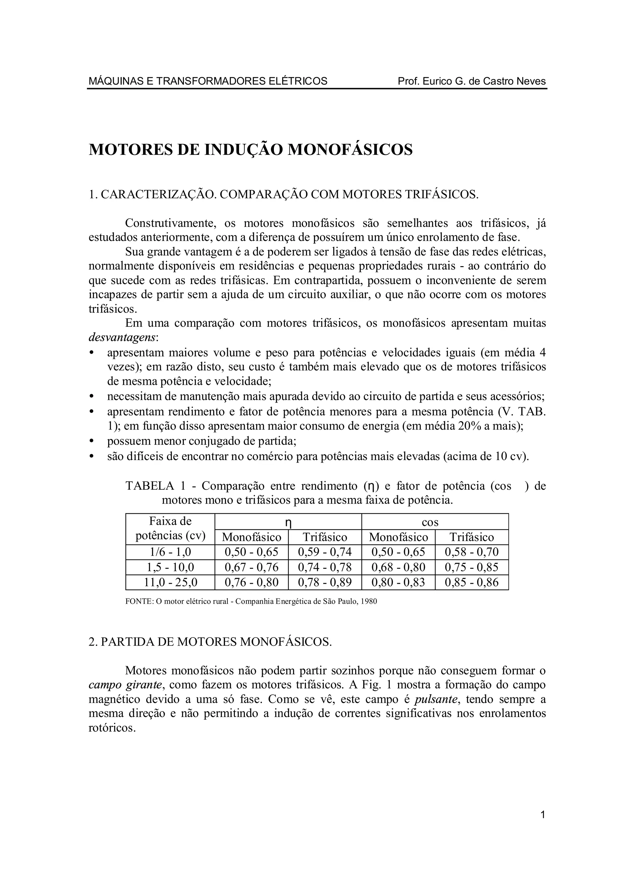 Este documento descreve os principais tipos de motores de indução monofásicos, comparando-os com motores trifásicos e explicando como cada um gera o campo magnético giratório necessário para iniciar a rotação. São descritos os motores de fase dividida, com capacitor de partida, com capacitor permanente e com dois capacitores, explicando suas vantagens e desvantagens em termos de conjugado de partida, eficiência e custo.