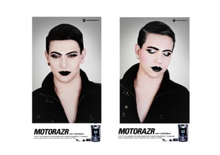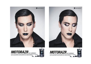 O documento discute a campanha publicitária da Motorola para o lançamento do celular Motorazr. A campanha utilizou o conceito de androginia, misturando características femininas e masculinas, de forma moderna, ousada e irreverente para se comunicar com o público. A releitura proposta destacou ainda mais os traços andróginos do ator por meio de maquiagem marcante, retratando a androginia como um estilo cada vez mais presente na sociedade contemporânea.