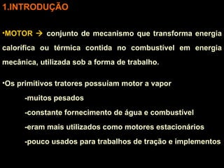 O documento descreve os principais componentes e sistemas de um motor a combustão interna. Resume que um motor é constituído por sistemas de arrefecimento, lubrificação, alimentação, conjunto móvel e elétrico. Detalha as principais peças como bloco, cabeçote e cárter, além de definir termos como ciclo, curso, volume do cilindro e taxa de compressão.