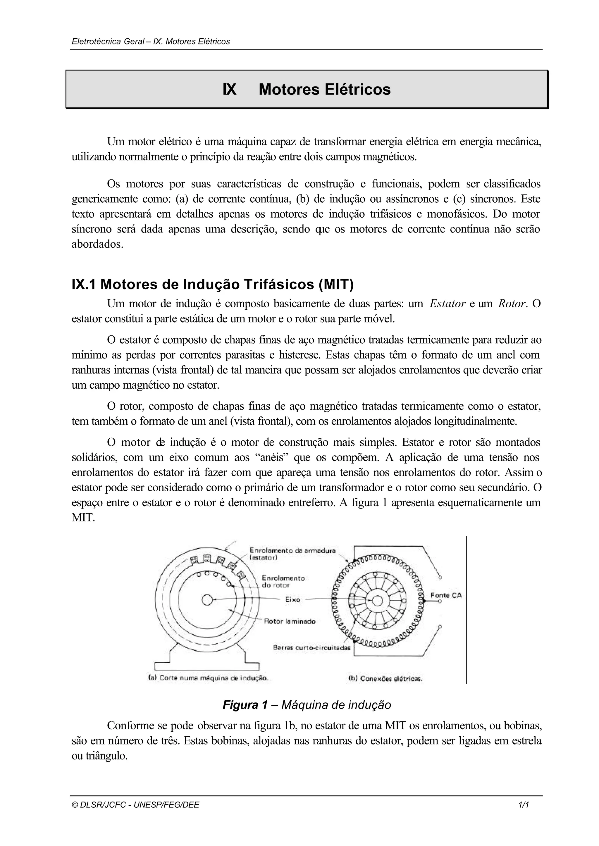 1) O documento descreve os principais tipos de motores elétricos, com foco nos motores de indução trifásicos.