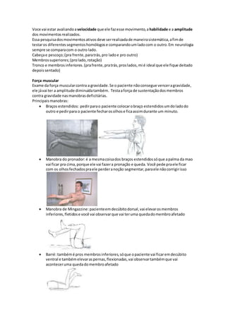 O documento resume os principais aspectos da neuroanatomia e da avaliação da motricidade. Apresenta os três tipos de motricidade (reflexa, automática e voluntária), o eixo funcional da motricidade e exames da amplitude, força muscular e tônus. Descreve as principais manobras para avaliar força nos membros e distúrbios da força como paresia, plegia e outros.