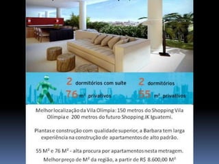 O documento fornece informações técnicas sobre um empreendimento residencial lançado em outubro de 2010, com 96 unidades de 55m2 ou 76m2 distribuídas em 20 andares, projetado por Marcio Cury & Azevedo Antunes e construído por Barbara Engenharia e Construtora Ltda em um terreno de 1.490,09m2.