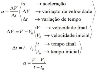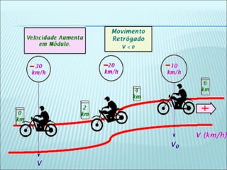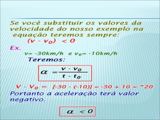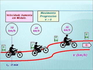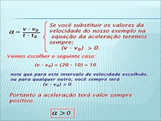 O documento discute movimento acelerado, no qual a velocidade aumenta ao longo do tempo e a aceleração e velocidade têm o mesmo sinal. Ele usa o exemplo de um motociclista se movendo ao longo de uma trajetória para ilustrar como a velocidade e aceleração mantêm o mesmo sinal, mesmo quando a direção do movimento é invertida.