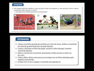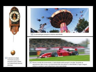 Este documento discute os conceitos de movimento, incluindo: 1) Movimento pode variar no espaço e no tempo; 2) Existem diferentes tipos de trajetórias e variações no tempo como movimento periódico, uniforme e acelerado; 3) O movimento de um objeto depende do referencial do observador.