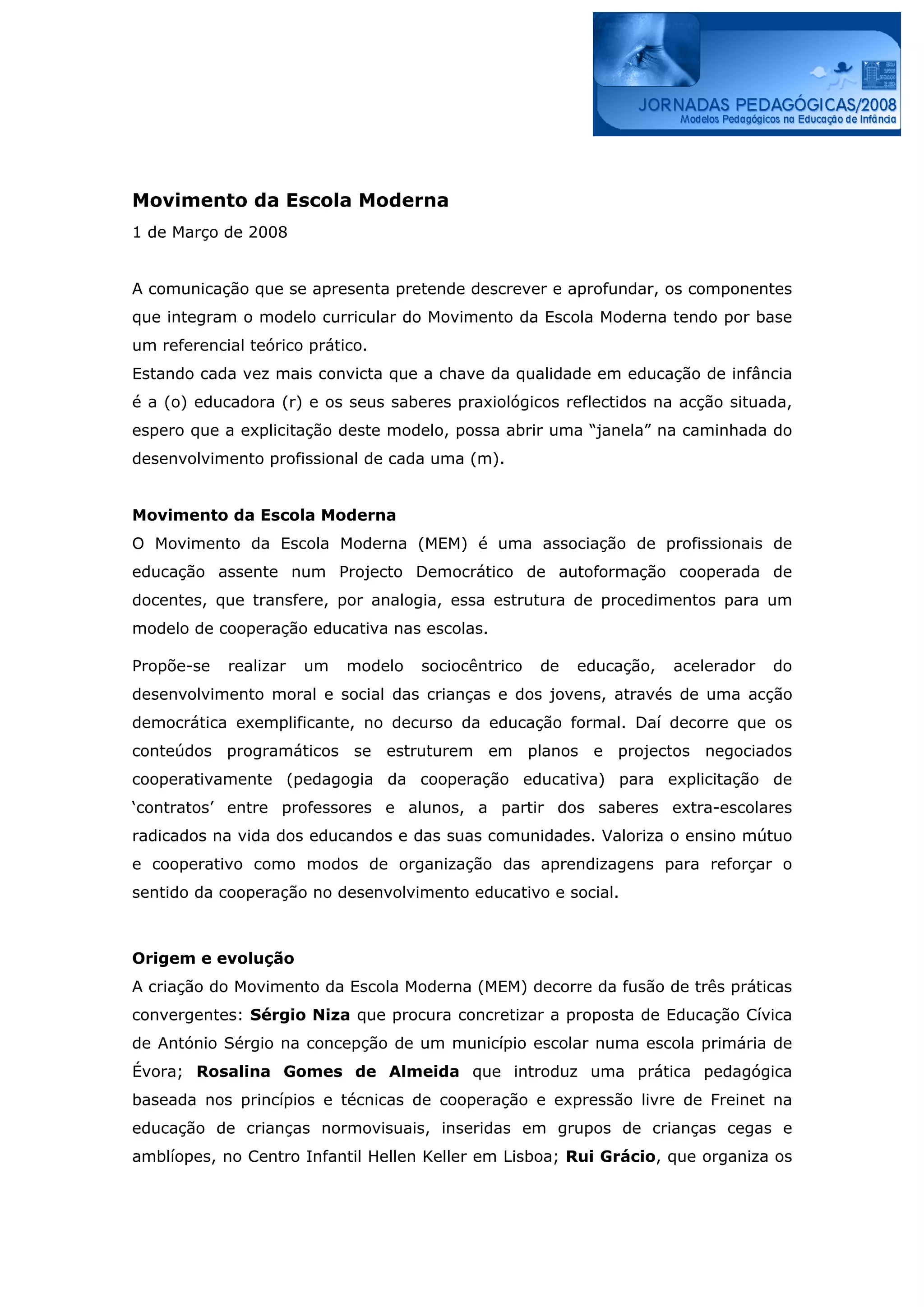 O documento descreve o modelo curricular do Movimento da Escola Moderna, que propõe uma educação sociocêntrica e democrática através da cooperação entre educadores e alunos. As crianças participam ativamente na planificação das atividades e avaliação dos processos de aprendizagem. A família e a comunidade também estão envolvidas no processo educativo.