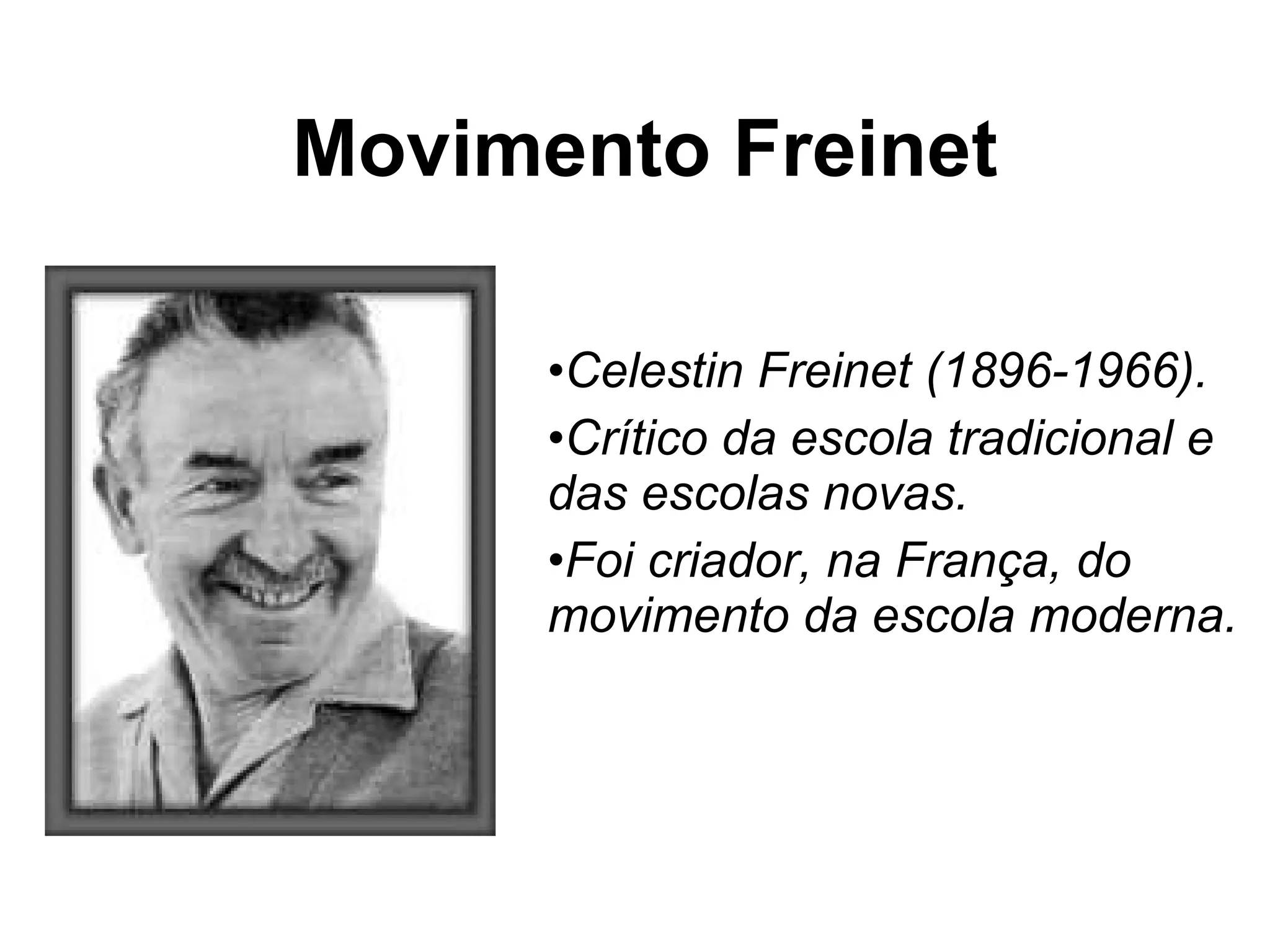 Celestin Freinet foi um pedagogo francês do século XX que criou o movimento da escola moderna. Ele criticava a escola tradicional e as escolas novas, propondo uma pedagogia baseada no trabalho, liberdade e comunidade. Freinet desenvolveu técnicas como o texto e desenho livres para favorecer o desenvolvimento natural da linguagem e das ciências a partir dos interesses da criança.