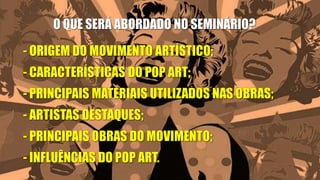 A pop art, ou arte popular, é um movimento artístico que surgiu na década de 1950 na Inglaterra e nos Estados Unidos. Este movimento foi uma reação ao expressionismo abstrato das décadas anteriores. A pop art caracteriza-se pela incorporação de elementos da cultura popular e do consumismo.