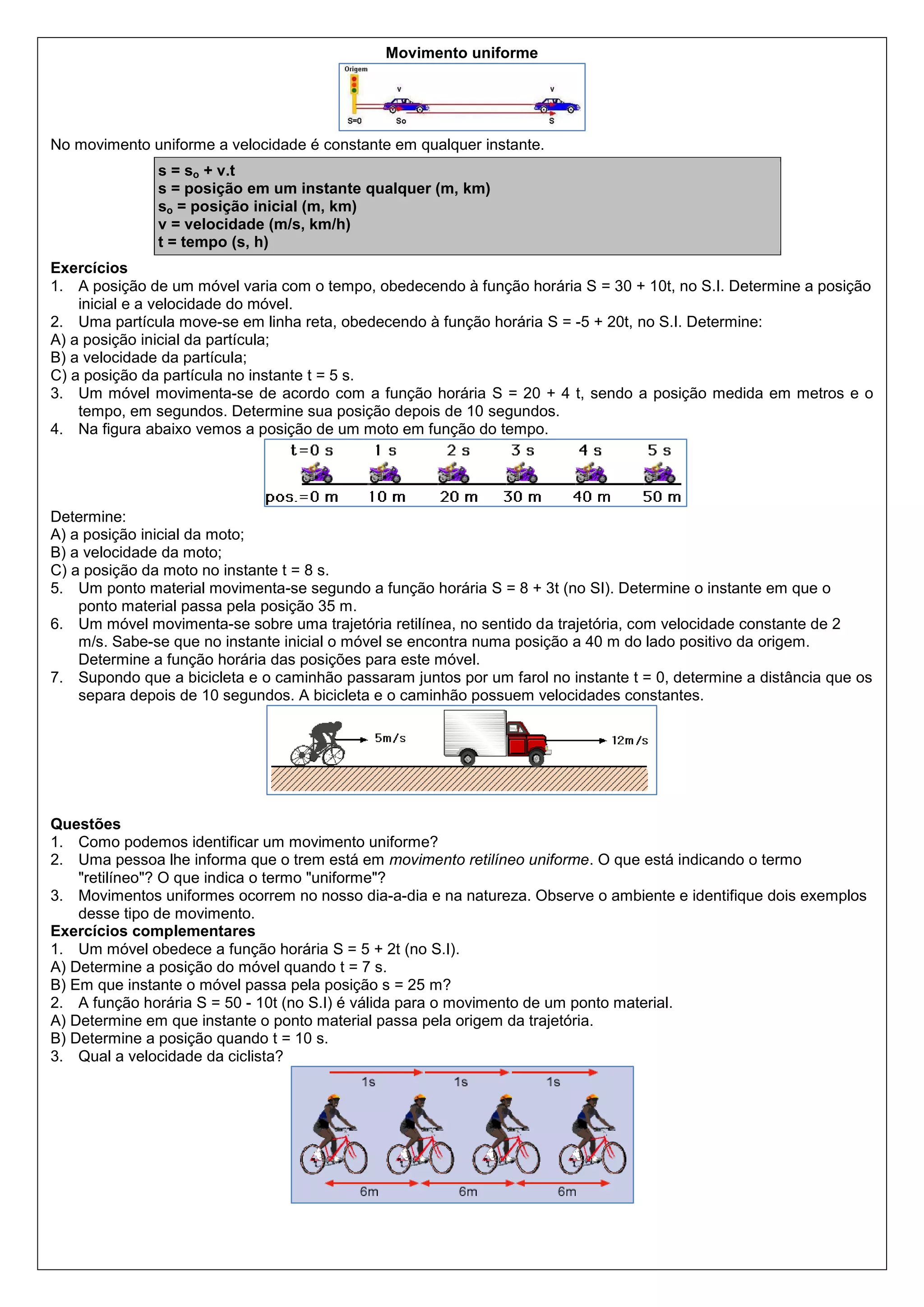 O documento descreve o movimento uniforme, no qual a velocidade é constante em qualquer instante. Apresenta a equação que relaciona a posição (s), posição inicial (so), velocidade (v) e tempo (t): s = so + v.t. Inclui também exercícios sobre cálculos envolvendo esta equação.