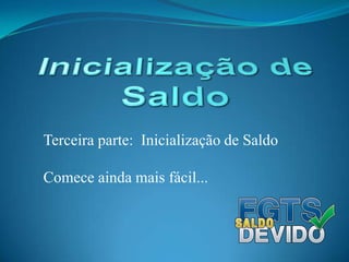 O documento fornece instruções sobre como inicializar o saldo da conta bancária. Explica que o usuário deve clicar no botão "Inserir Saldo", escolher se quer lançar um saldo inicial ou calcular perdas de planos econômicos, e preencher os campos solicitados com as datas, valores de depósitos e saques antes de concluir a operação.