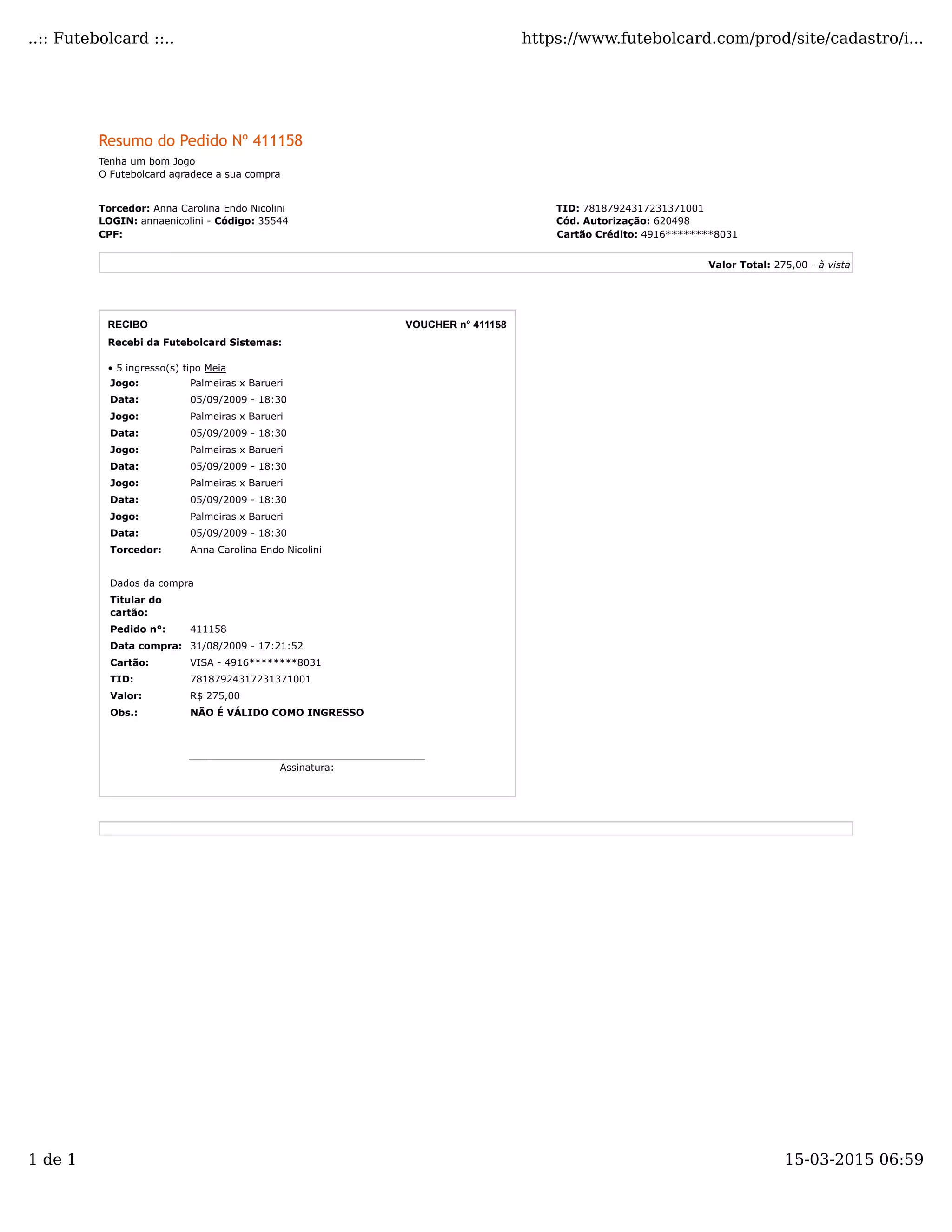 Anna Carolina Endo Nicolini comprou 5 ingressos tipo meia para o jogo Palmeiras x Barueri no dia 5 de setembro de 2009 às 18h30, pagando R$275,00 à vista com cartão de crédito VISA.