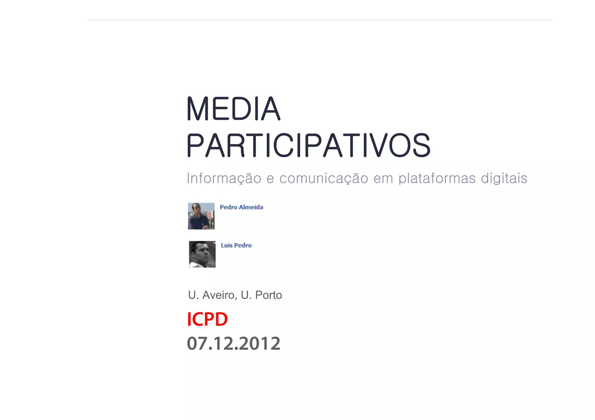 Este documento discute os media participativos e como eles alteraram o papel dos usuários de consumidores para prosumers. Ele explora como os media participativos podem ser usados para educação, cidadania, informação e entretenimento, e fornece exemplos de ferramentas digitais para cada área. O documento também descreve os objetivos e conteúdos programáticos de um curso sobre media participativos.