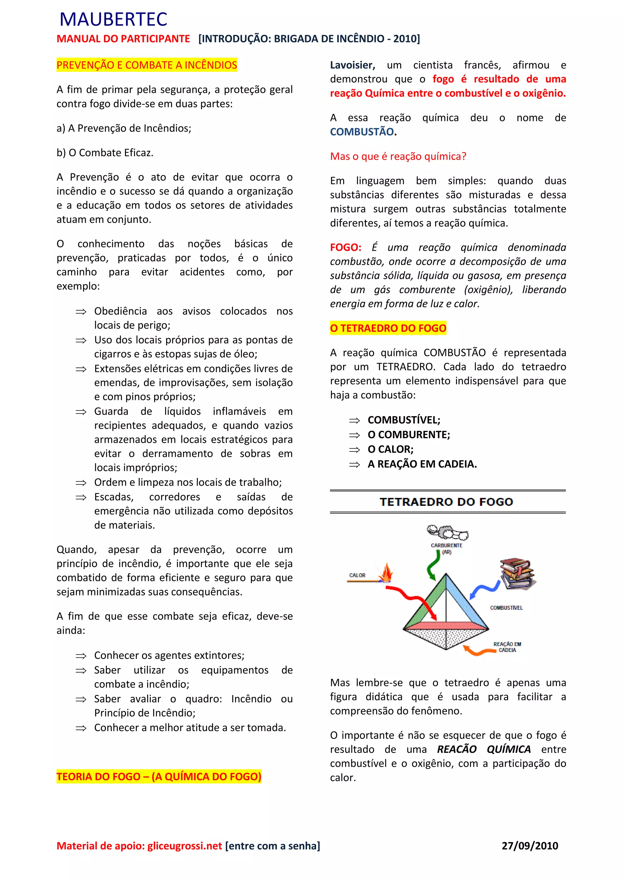 2) É explicado o tetraedro do fogo representando os quatro elementos necessários - combustível, comburente, calor e reação em cadeia.