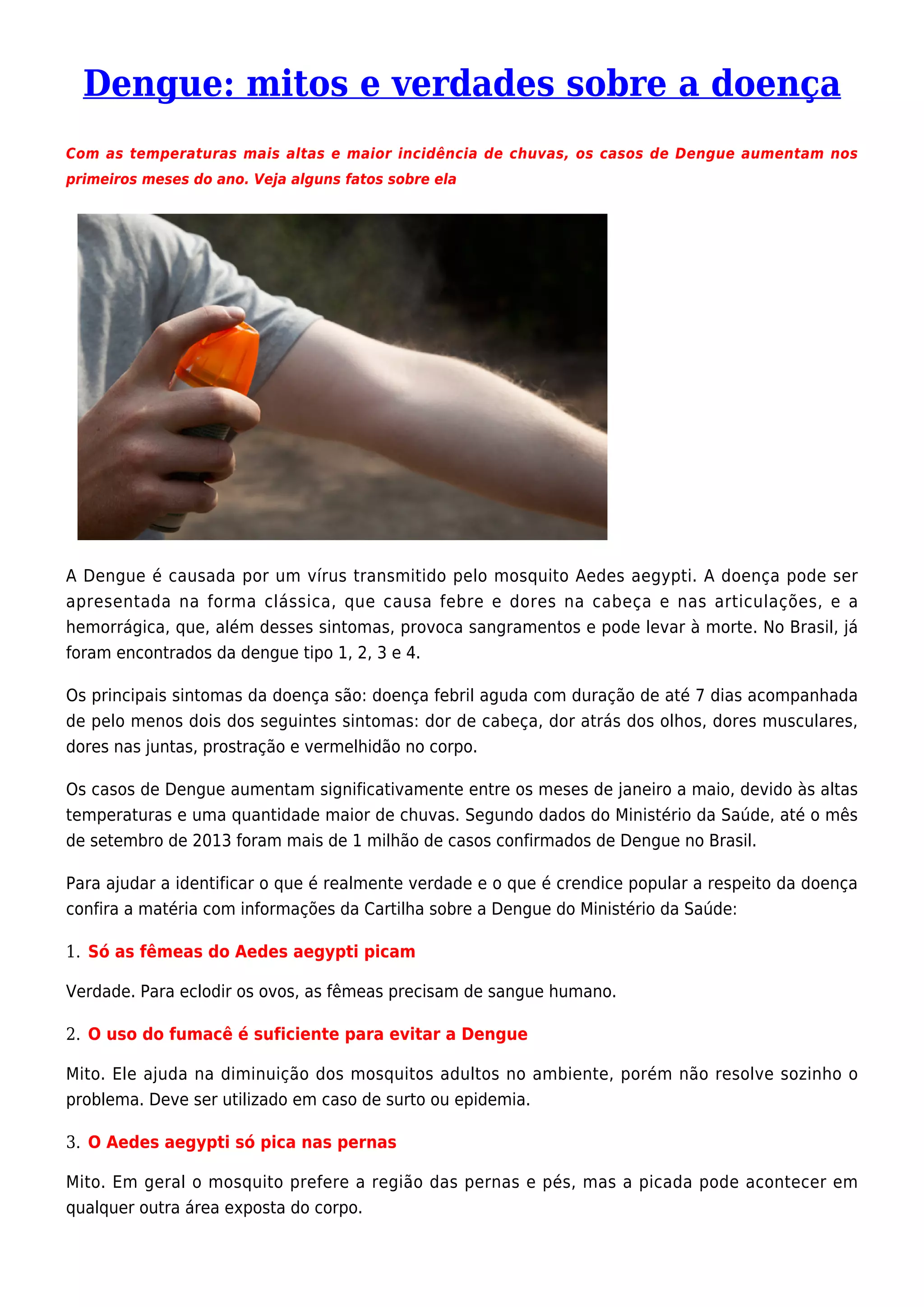 O documento discute os principais fatos sobre a Dengue, incluindo como é transmitida, sintomas e mitos versus verdades sobre a doença. A Dengue é transmitida pelo mosquito Aedes aegypti e pode apresentar formas clássica ou hemorrágica. O documento esclarece vários mitos e verdades sobre a doença.