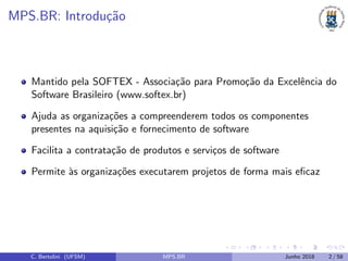 O documento apresenta uma introdução ao MPS.BR, que visa melhorar os processos de software no Brasil, especialmente para pequenas e médias empresas. O MPS.BR é mantido pela SOFTEX e oferece sete níveis graduais de maturidade de processo, compatíveis com CMMI e normas internacionais.