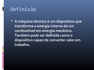 O documento descreve as principais máquinas térmicas, incluindo a máquina a vapor, turbina a vapor e motor de combustão interna. Explica como cada uma transforma a energia térmica em energia mecânica através de processos como expansão, compressão e queima de combustível.