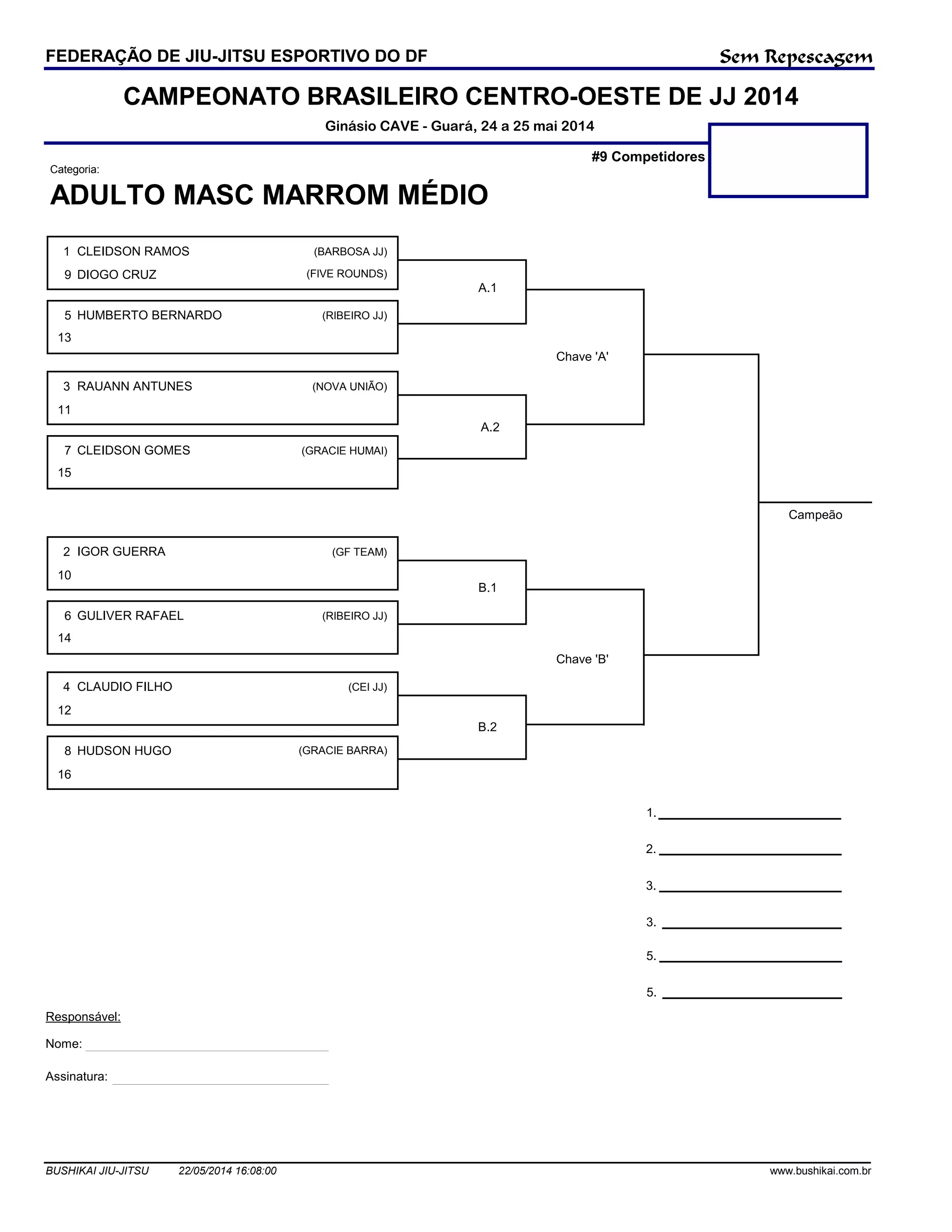 1) O documento descreve o campeonato brasileiro centro-oeste de jiu-jitsu de 2014 na categoria adulto masculino marrom médio. 2) Havia 9 competidores sem repescagem. 3) O campeão foi Humberto Bernardo do Ribeiro JJ.