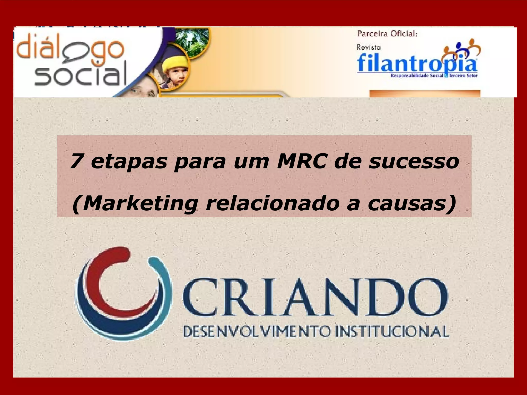 O documento fornece orientações sobre planejamento estratégico para marketing relacionado a causas (MRC) em 7 etapas: 1) planejamento, 2) marca, 3) alinhamento de valores, 4) construção da parceria, 5) marketing e treinamento, 6) monitoramento, 7) dicas. A primeira etapa enfatiza a importância de definir visão, missão e valores e estabelecer objetivos e estratégias. O sucesso de um MRC depende de alinhar os valores da organização com a empresa parceira e formalizar os termos da