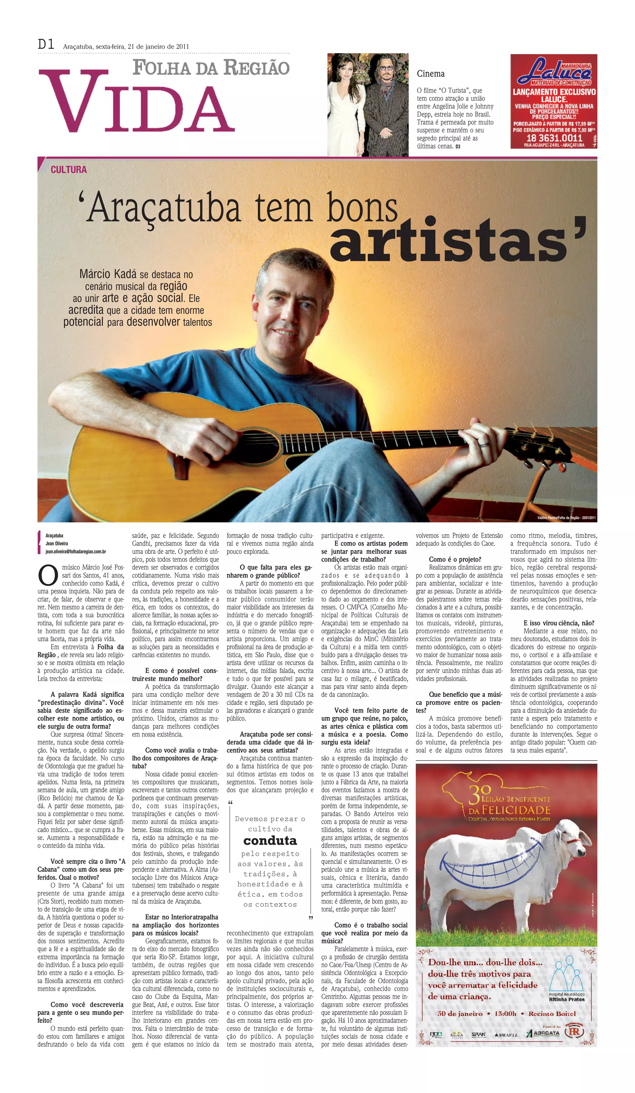 O documento discute a produção artística na cidade de Araçatuba, apresentando a opinião do músico Márcio Kadá sobre o assunto. Kadá acredita que a cidade tem potencial para desenvolver talentos musicais e que os artistas locais precisam se divulgar mais para alcançar maior público e reconhecimento. O texto também descreve um projeto social que usa atividades musicais para reduzir a ansiedade de pacientes em uma clínica odontológica.
