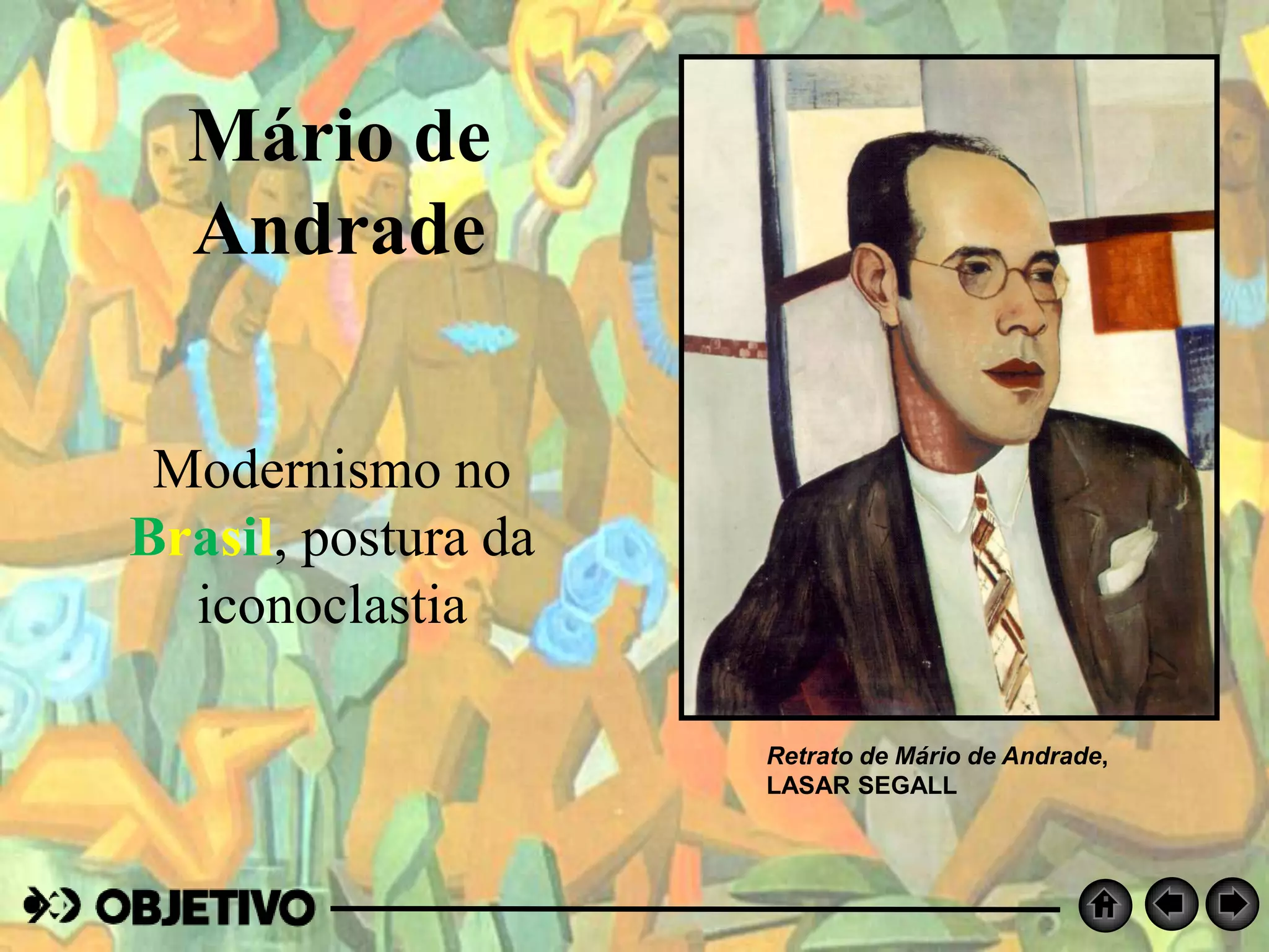 Este documento apresenta a vida e obra do escritor modernista brasileiro Mário de Andrade. Detalha sua inspiração na cidade de São Paulo e uso de recursos musicais e linguagem próxima da oralidade em obras como Pauliceia Desvairada e Macunaíma. Apresenta trechos de cartas onde Mário de Andrade discute suas técnicas de apropriação e reelaboração de fontes diversas em suas obras consideradas marcos do Modernismo brasileiro.