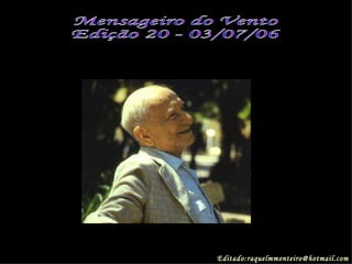 Mário Quintana fala sobre sua vida e obra em uma entrevista de 1984. Ele nasceu em Alegrete no Rio Grande do Sul em 1906 e acredita que esse foi o evento mais importante de sua vida. Quintana diz que sua vida está expressa em seus poemas, que são uma confissão. Apesar de ter 78 anos, ele se sente sem idade, acreditando que só existem duas idades, vivo ou morto.