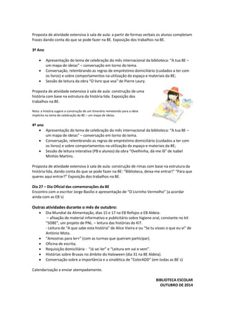 Este documento apresenta o programa de atividades para o Mês Internacional da Biblioteca Escolar em outubro de 2014 nas bibliotecas de uma escola. Inclui apresentações da biblioteca, sessões de leitura, exposições de trabalhos e visita de um escritor para diferentes níveis de ensino, com foco no tema "A tua biblioteca escolar: um mapa de ideias".