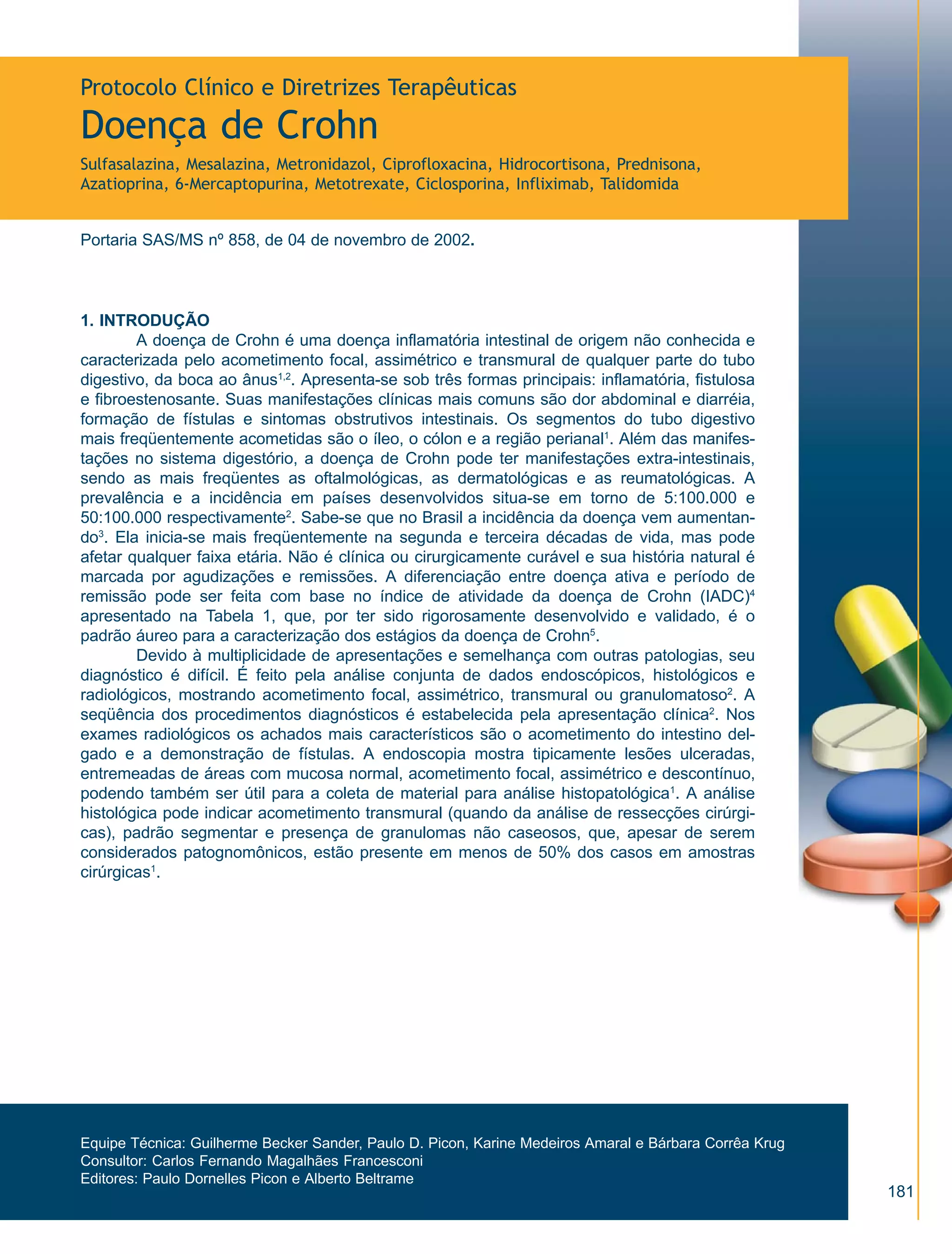 Este documento apresenta diretrizes para o tratamento da doença de Crohn, discutindo o uso de sulfassalazina, mesalazina, corticóides, antibióticos, imunossupressores, ciclosporina e infliximab. Detalha as opções de tratamento para episódios agudos e manutenção de remissão, assim como o manejo de fístulas e complicações.