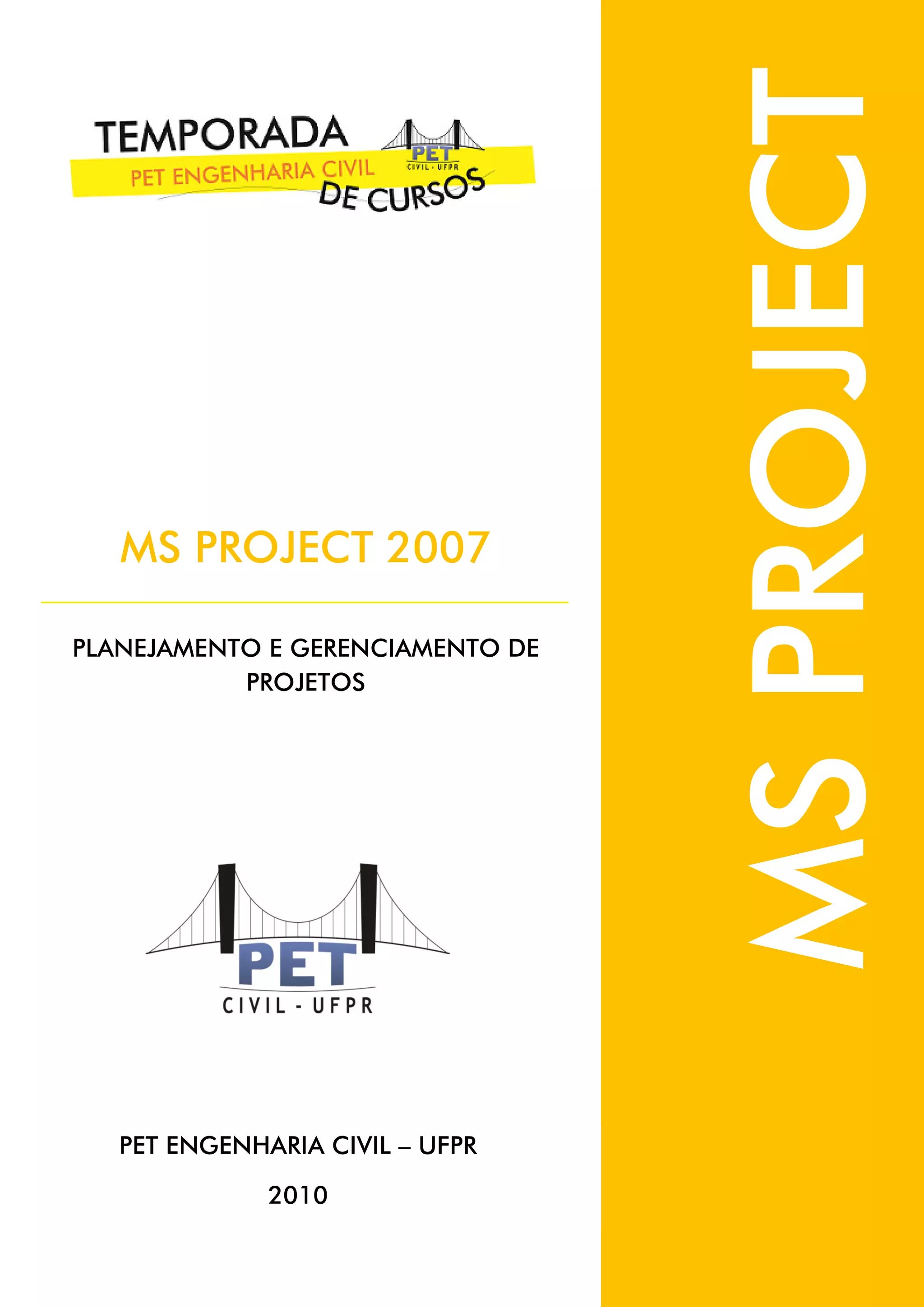 O documento apresenta um manual sobre o uso do software MS Project 2007 para planejamento e gerenciamento de projetos. Ele descreve a interface do programa, como criar e parametrizar um novo projeto, adicionar e vincular tarefas, trabalhar com recursos e calendários, acompanhar a execução do projeto e gerar relatórios.