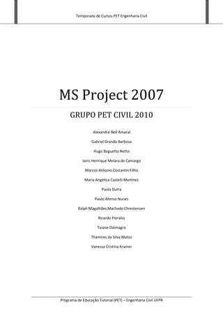 1) O documento apresenta um guia sobre o software Microsoft Project 2007, com instruções sobre como planejar, gerenciar e acompanhar projetos utilizando o programa. 2) É descrita a interface do software, como criar e parametrizar novos projetos, adicionar e vincular tarefas, trabalhar com recursos, acompanhar a execução do projeto e gerar relatórios. 3) O guia também aborda conceitos de planejamento e gerenciamento de projetos, além de apresentar ferramentas do software como o gráfico de Gantt e camin
