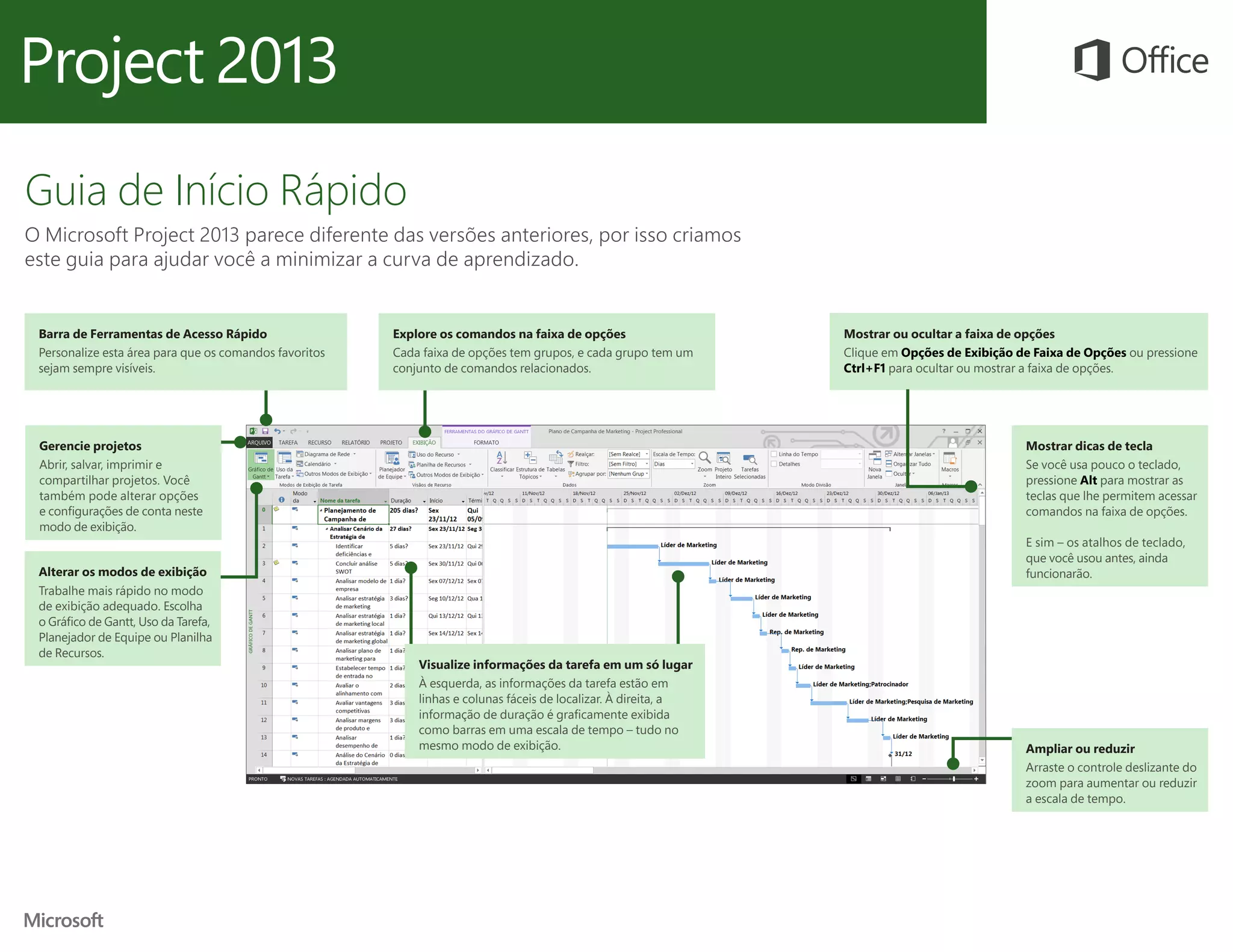 O documento fornece um guia sobre as funcionalidades e melhorias do Microsoft Project 2013, incluindo a personalização da barra de ferramentas, gerenciamento de projetos, e modos de visualização. Ele explica como iniciar um projeto, agendar tarefas, e utilizar recursos como o gráfico de Gantt e relatórios visuais. Também aborda a compatibilidade com versões anteriores do Project e a utilização do Project Online para acesso remoto.