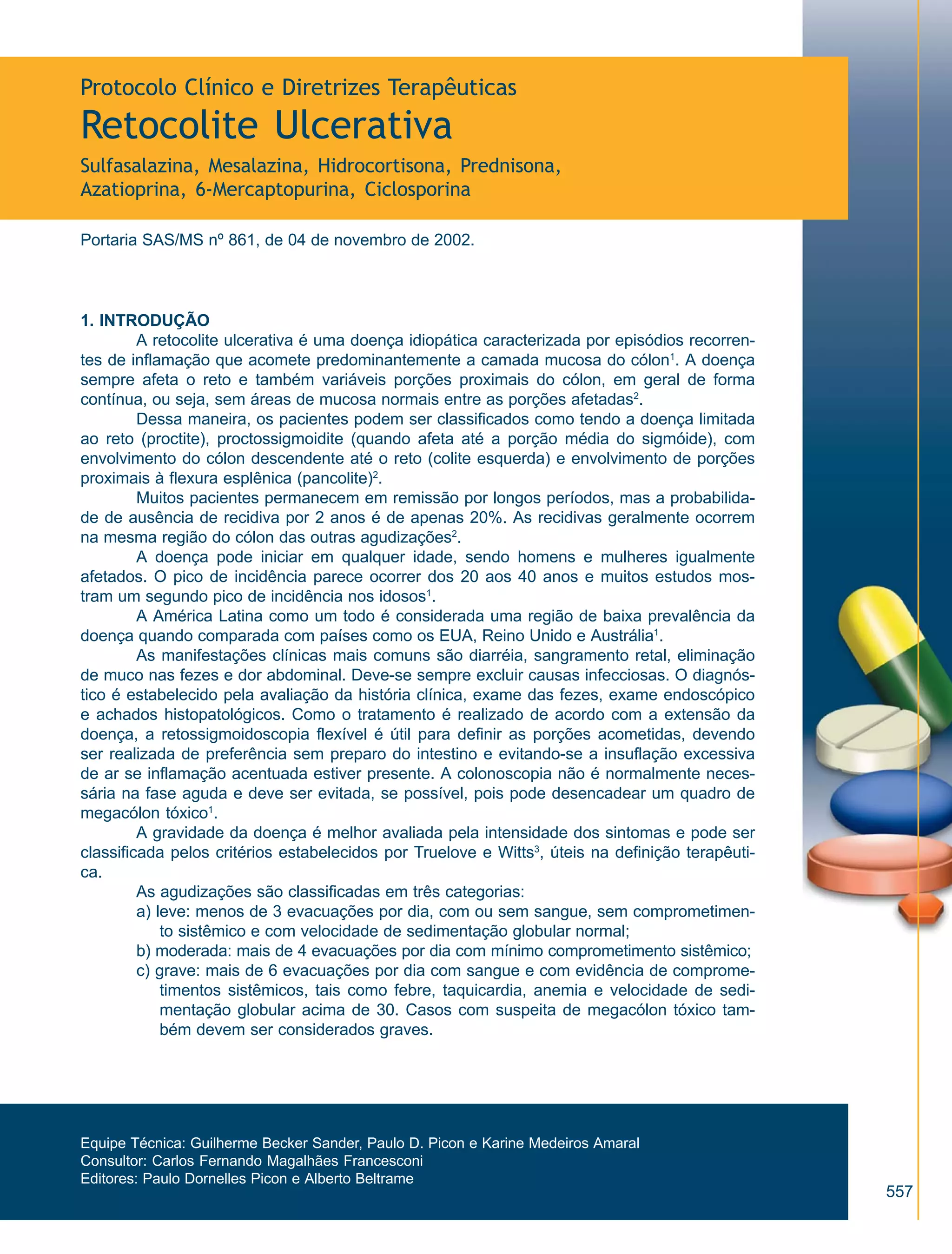 Este documento fornece diretrizes sobre o tratamento da retocolite ulcerativa, incluindo o uso de sulfasalazina, mesalazina, hidrocortisona, prednisona, azatioprina, 6-mercaptopurina e ciclosporina. Ele descreve a classificação, critérios de inclusão e exclusão, esquemas de tratamento para diferentes estágios da doença, monitoramento de efeitos adversos e benefícios esperados dos tratamentos.