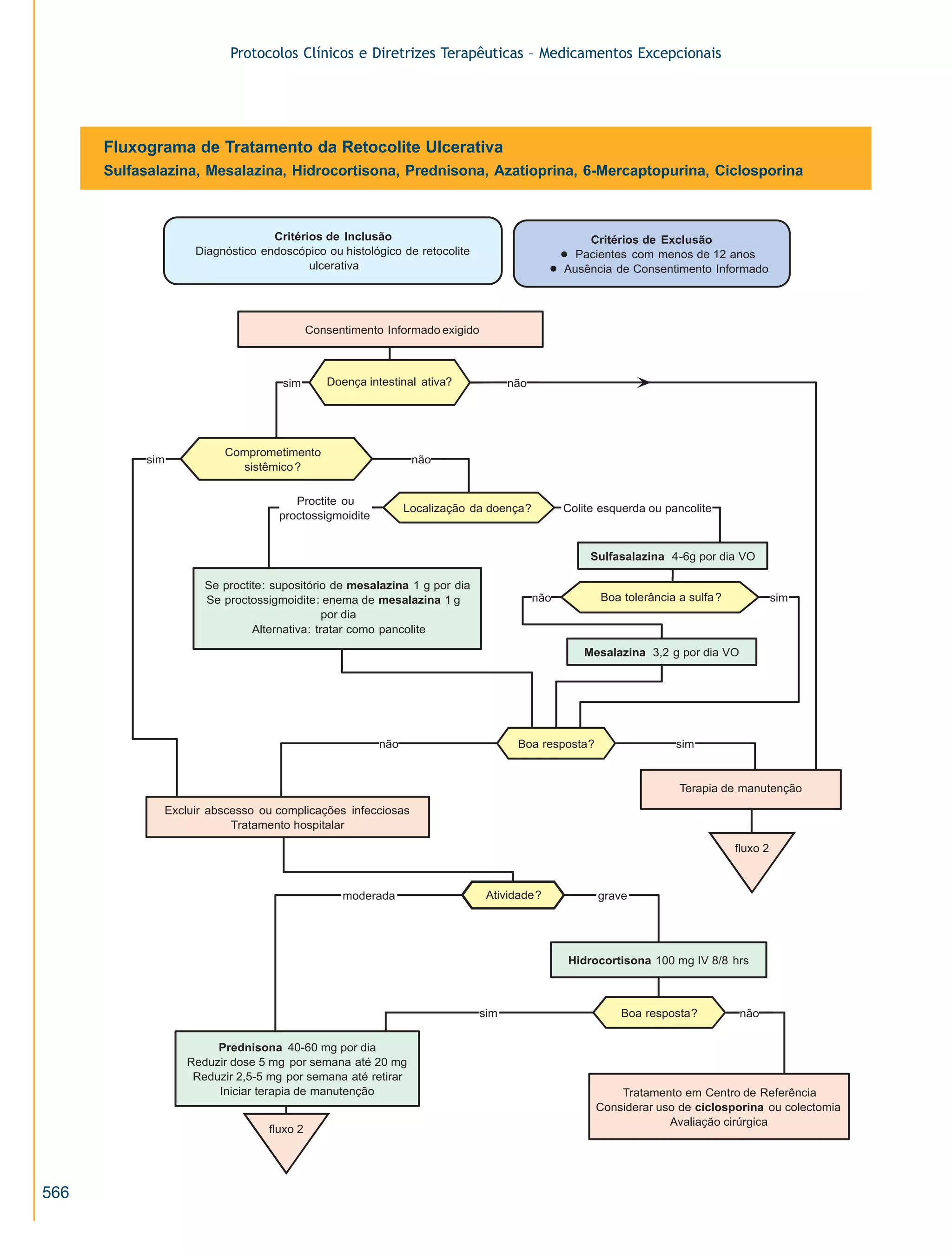 O documento apresenta protocolos clínicos e diretrizes terapêuticas para o tratamento da retocolite ulcerativa, incluindo fluxogramas para as fases de tratamento e manutenção. É descrito o uso de medicamentos como sulfasalazina, mesalazina, hidrocortisona, prednisona, azatioprina e 6-mercaptopurina no tratamento da doença.