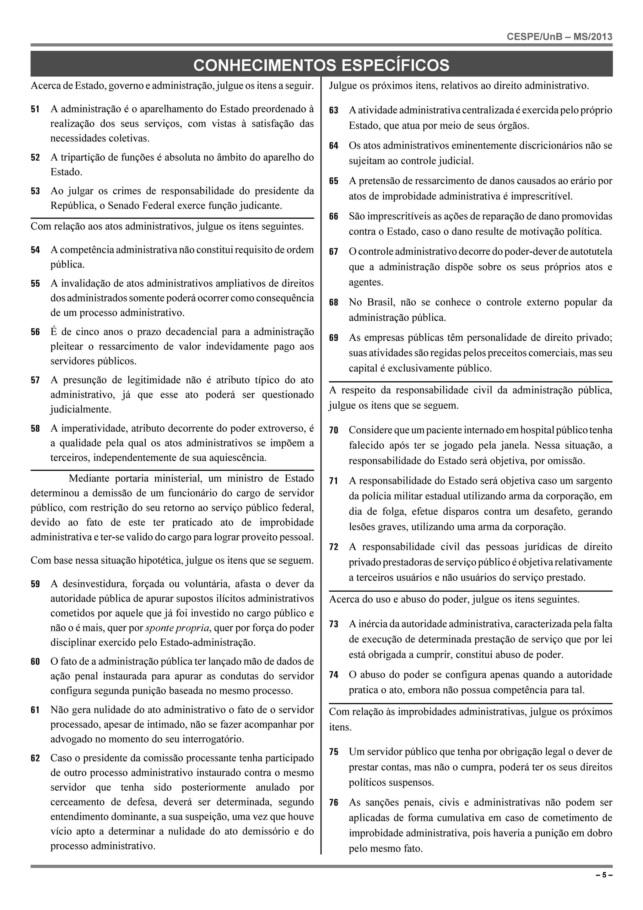 O documento apresenta uma série de questões sobre direito administrativo brasileiro. As questões abordam tópicos como Estado, governo e administração pública; atos administrativos; improbidade administrativa; serviços públicos; organização administrativa; controle e responsabilização da administração; e direitos e garantias fundamentais. O documento deve ser analisado para fins de prova sobre conhecimentos específicos em direito administrativo.