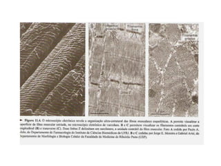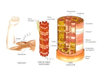 Os músculos são formados por fibras musculares multinucleadas capazes de contração. Cada fibra é inervada por um único neurônio na unidade motora. As fibras possuem filamentos de miosina e actina que causam a contração nos sarcômeros delimitados por linhas Z. Há também fibras vermelhas lentas resistentes à fadiga e fibras brancas rápidas mais suscetíveis à fadiga.