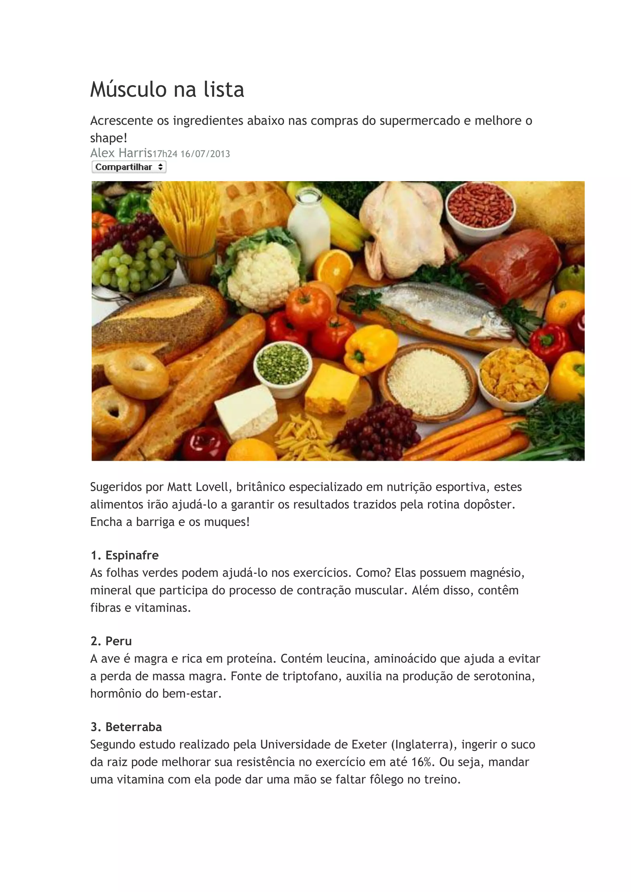 Este documento lista 8 alimentos que podem ajudar a melhorar o desempenho e recuperação muscular. Ele recomenda espinafres, peru, beterraba e peixes gordurosos como salmão e sardinha por seus benefícios como magnésio, proteínas, resistência e anti-inflamatórios. Também sugere milho, ovos, filé mignon, cordeiro por seus carboidratos, proteínas, vitaminas e minerais que auxiliam no ganho de força e massa muscular.