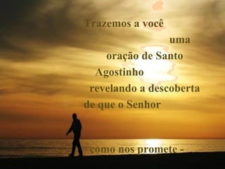 O documento é uma oração de Santo Agostinho revelando que, apesar de procurar Deus nas criações, Ele estava dentro de Agostinho o tempo todo. A oração pede que Deus cure nossa cegueira e surdez para que possamos sentir Sua presença dentro de nós.